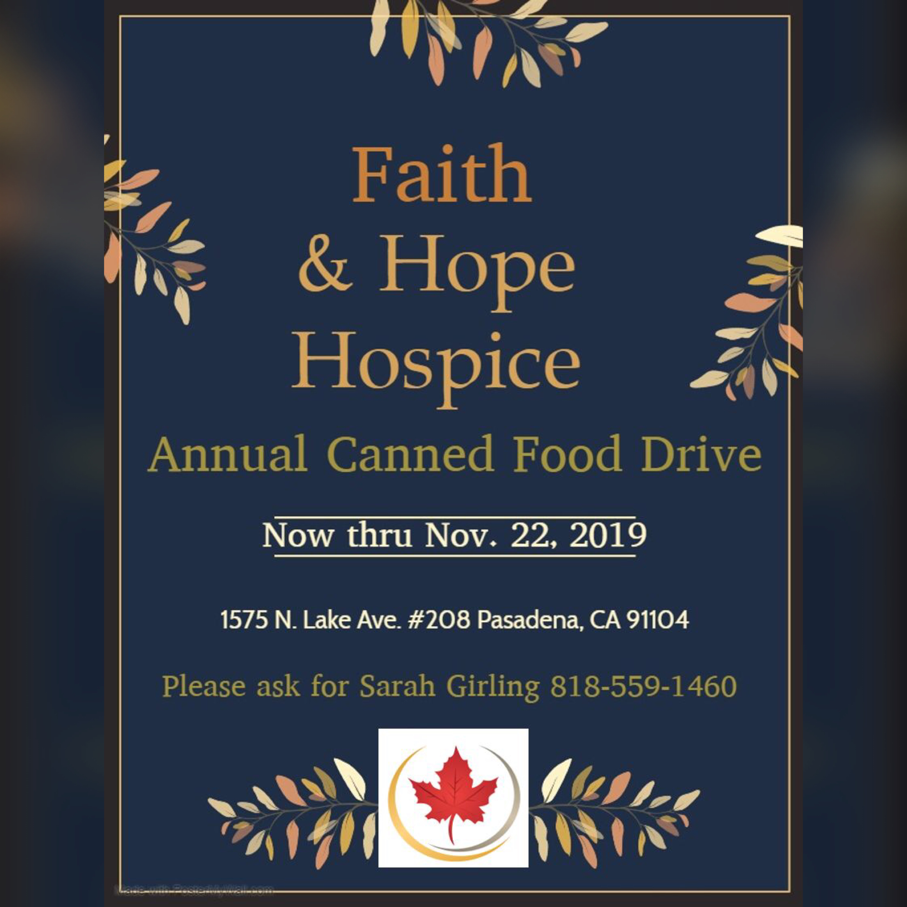 Hope everyone is ready for the upcoming Holiday Season! Beginning now, Faith & Hope Hospice and Palliative Care in Los Angeles, CA will be leading our annual canned food drive and would appreciate everyone to donate what they can of any closed canned food items. This year, we are donating to Alexandria House, a non-profit